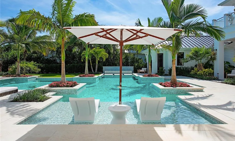 As Southwest Florida’s premier luxury pool builder, we were proud to build this resort-style residential pool in the heart of downtown Naples, Florida. The integrated spa, swim-up bar, sun shelf, and other amenities make this custom pool a fabulous escape where memories will be made for years to come in the beautiful Aqualane Shores community.